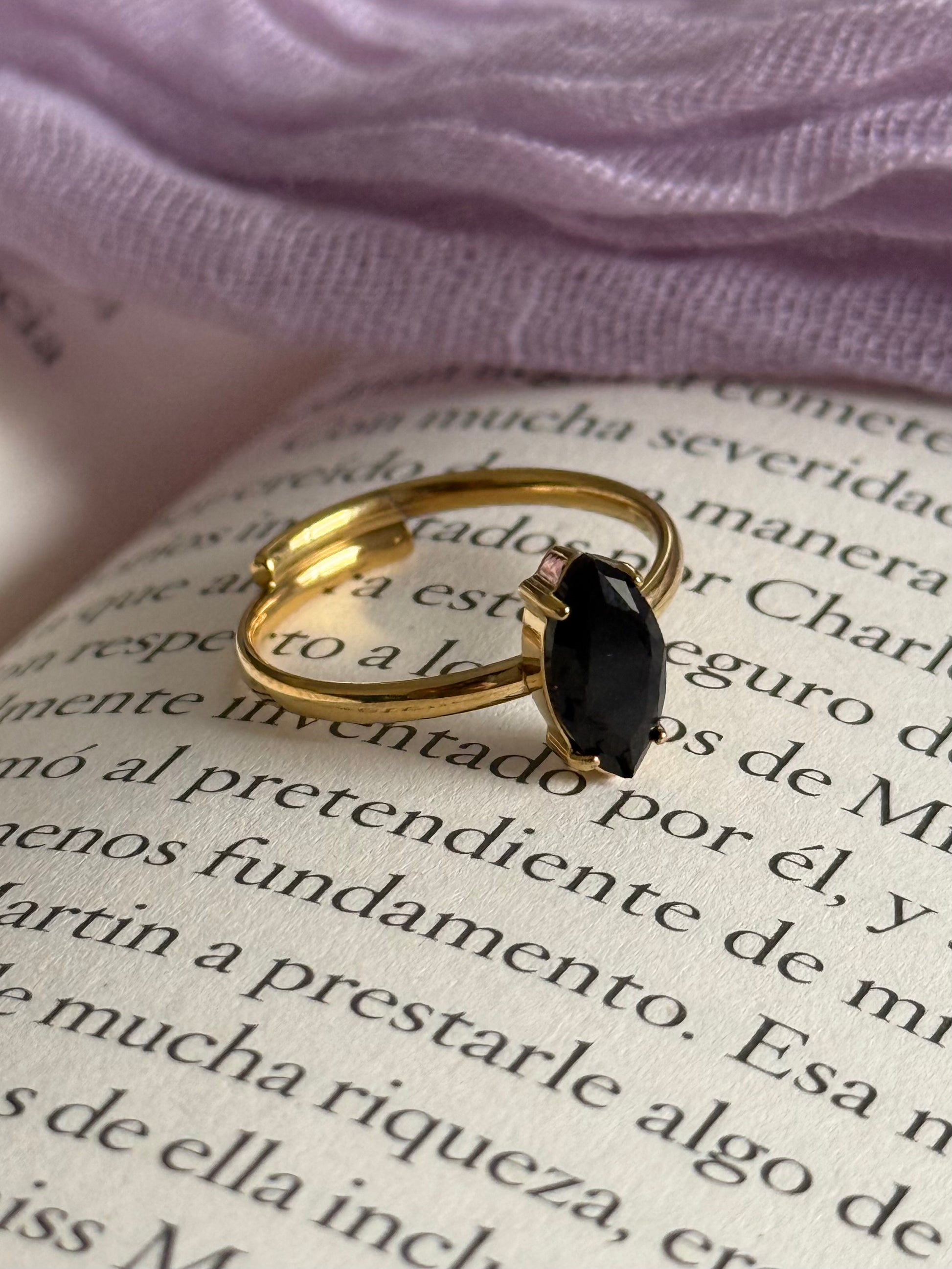Material: Anillo de acero inoxidable con baño dorado y piedra natural de ónix. Diseño ajustable que se adapta a cualquier dedo.