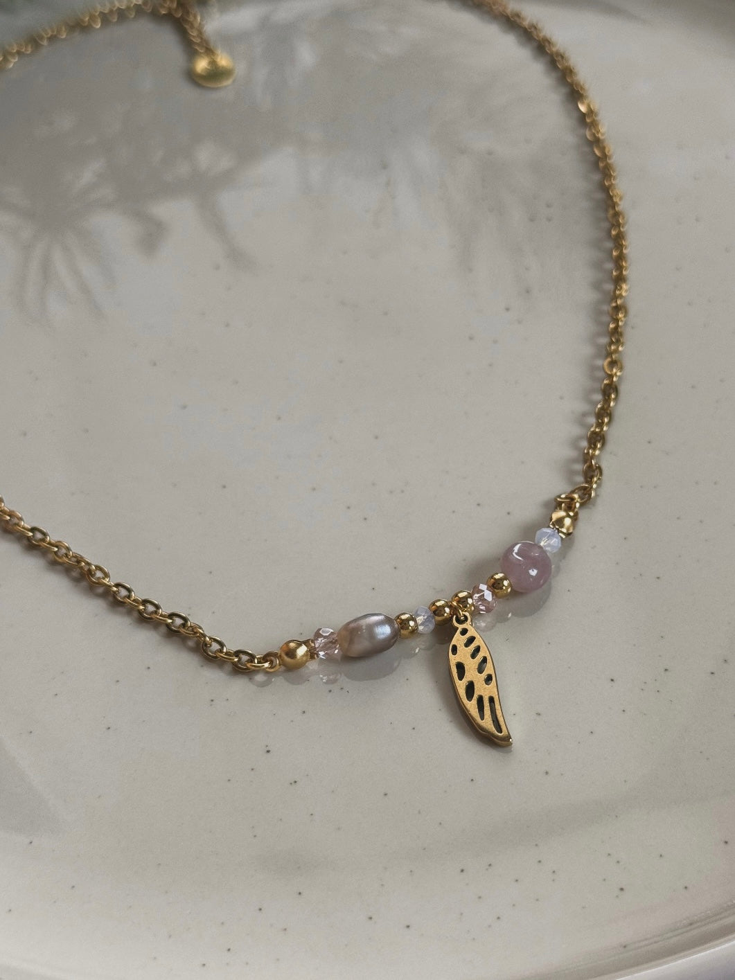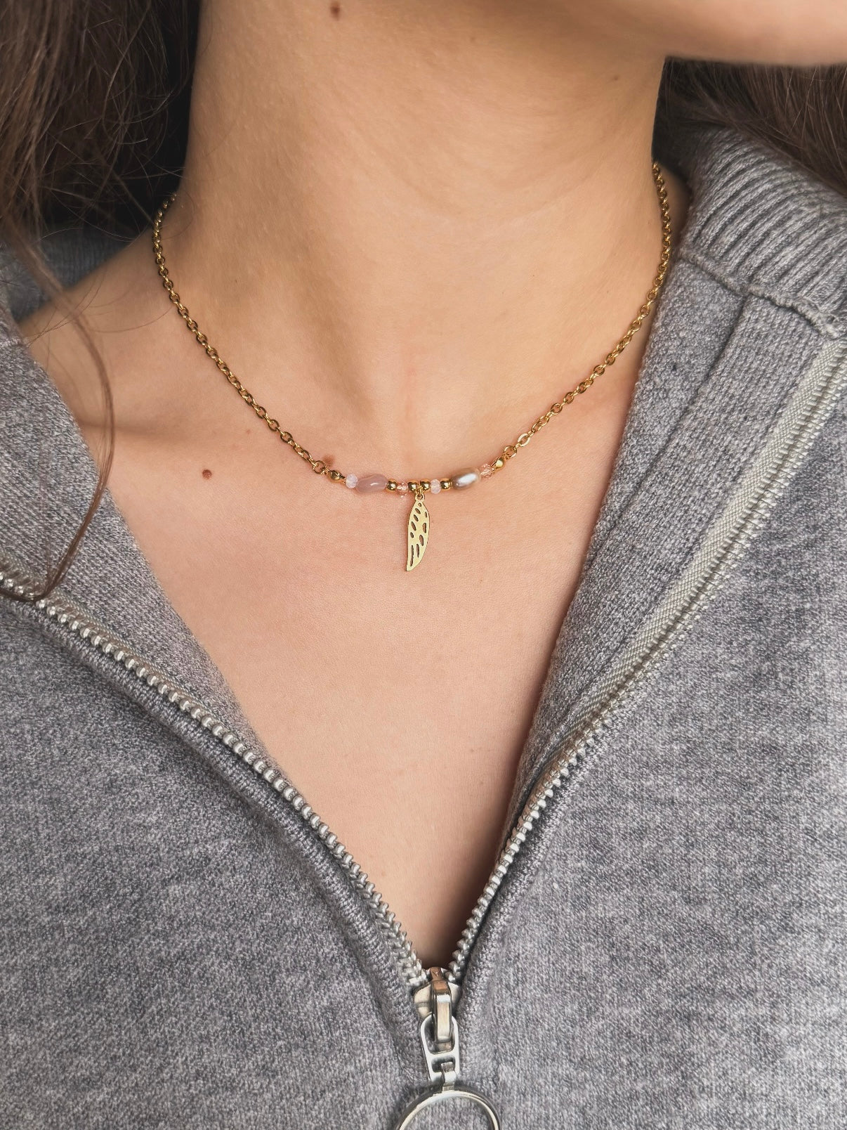 El collar lleva una delicada alita de ángel dorada junto al cuarzo rosa y una perla natural cultivada, creando un efecto mágico y celestial. El cuarzo rosa aporta la energía del amor, la perla la pureza y sabiduría, mientras que la alita dorada simboliza la protección angelical que te acompaña siempre.