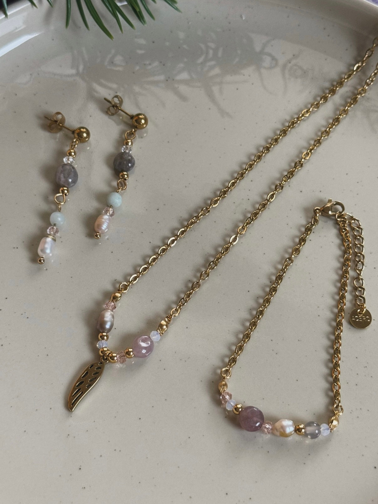 Este conjunto único reúne piedras naturales con propiedades complementarias que crean una sinergia de amor, pureza, equilibrio y protección celestial. Cada pieza se complementa con las demás, creando un look completo y armonioso.