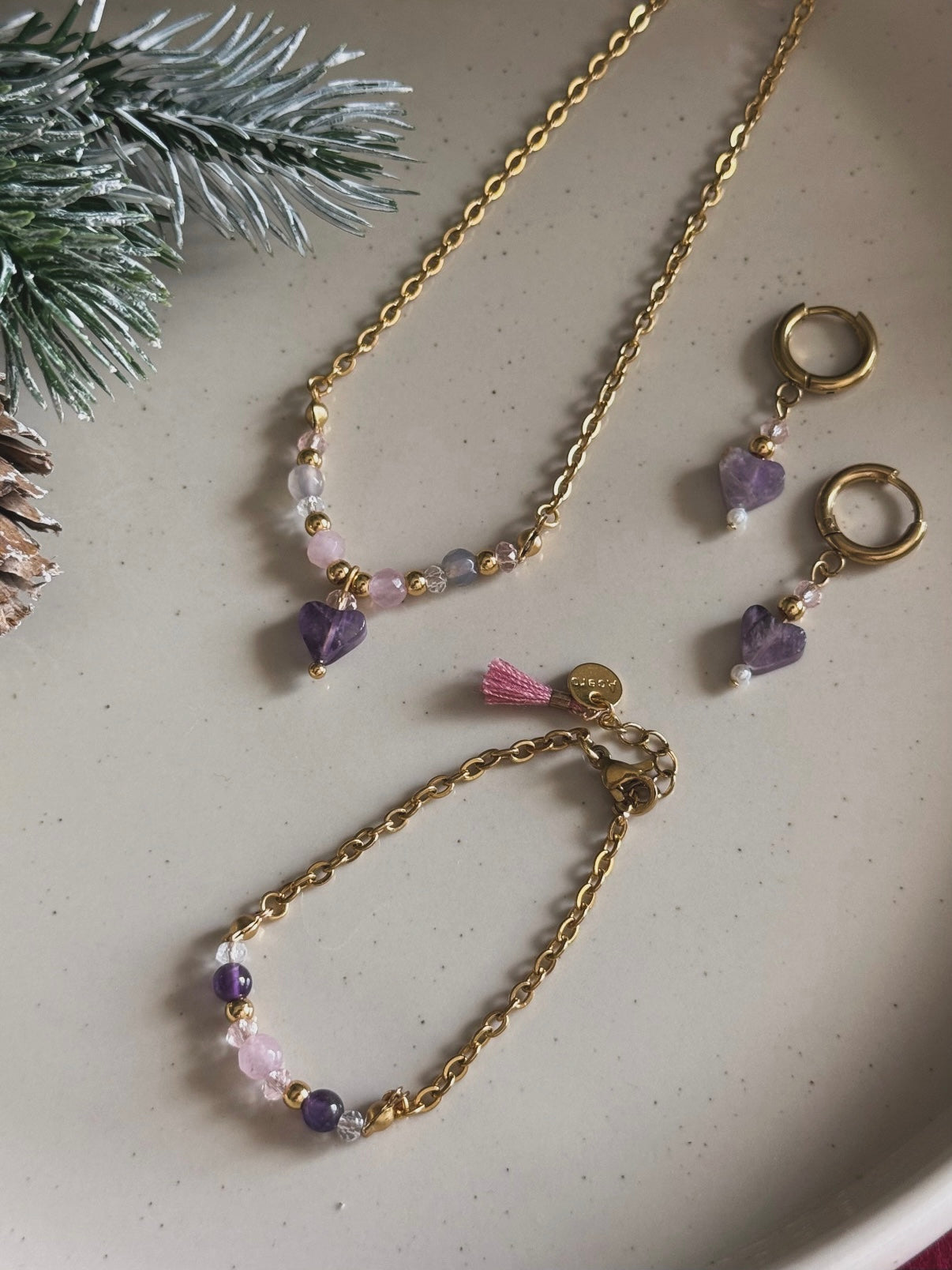 El conjunto Enyor es una pieza completa de la colección Entre Nuvols, diseñado especialmente para los más pequeños. Este set incluye pendientes, pulsera y collar elaborados con amatista natural y cuarzo rosa, creando un conjunto mágico y armonioso.