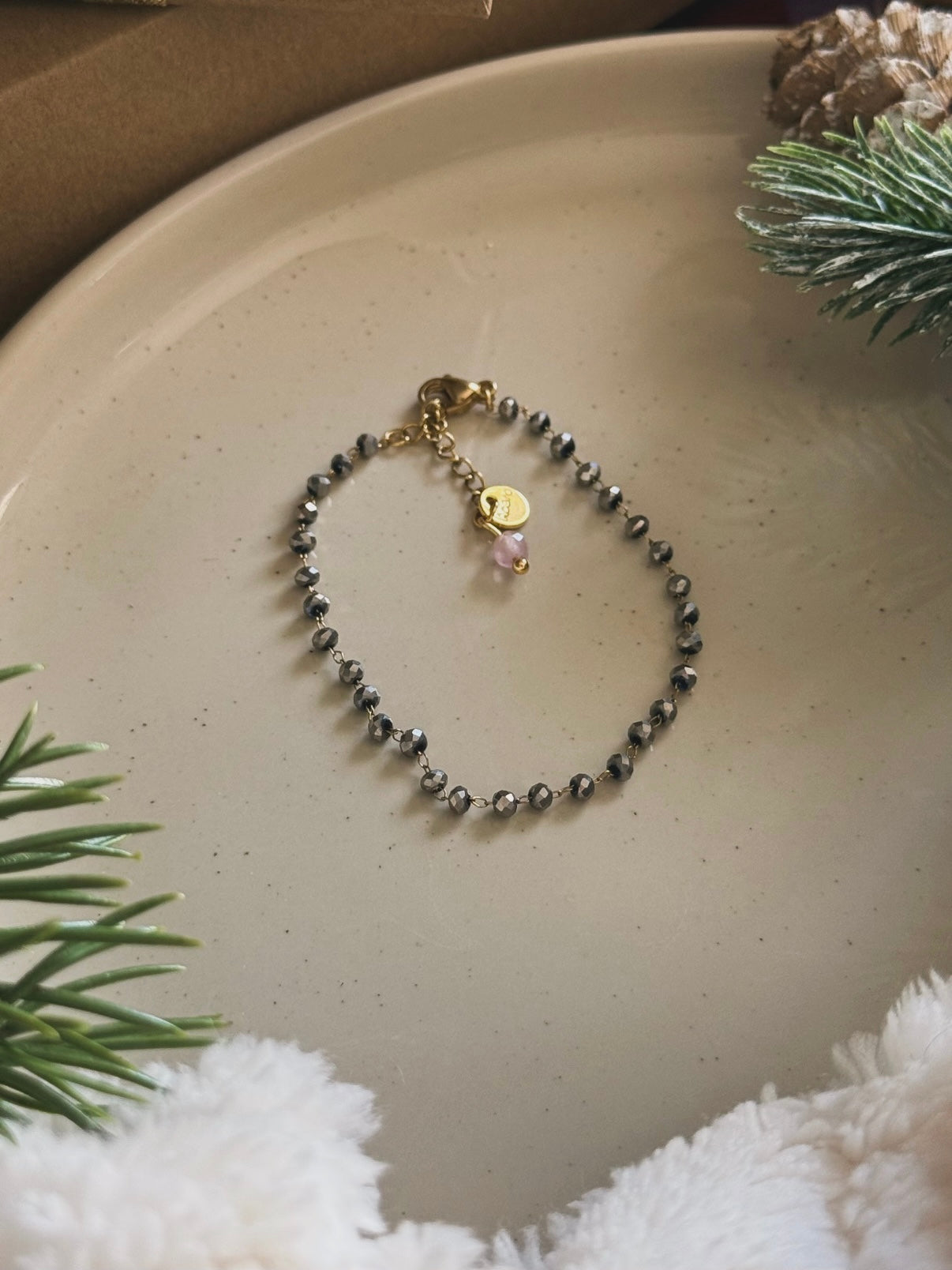 Pulsera artesanal elaborada con cuarzo rosa natural que captura la esencia del amor eterno y la ternura infinita. Perfecta para conectar con la energía del corazón cada día.