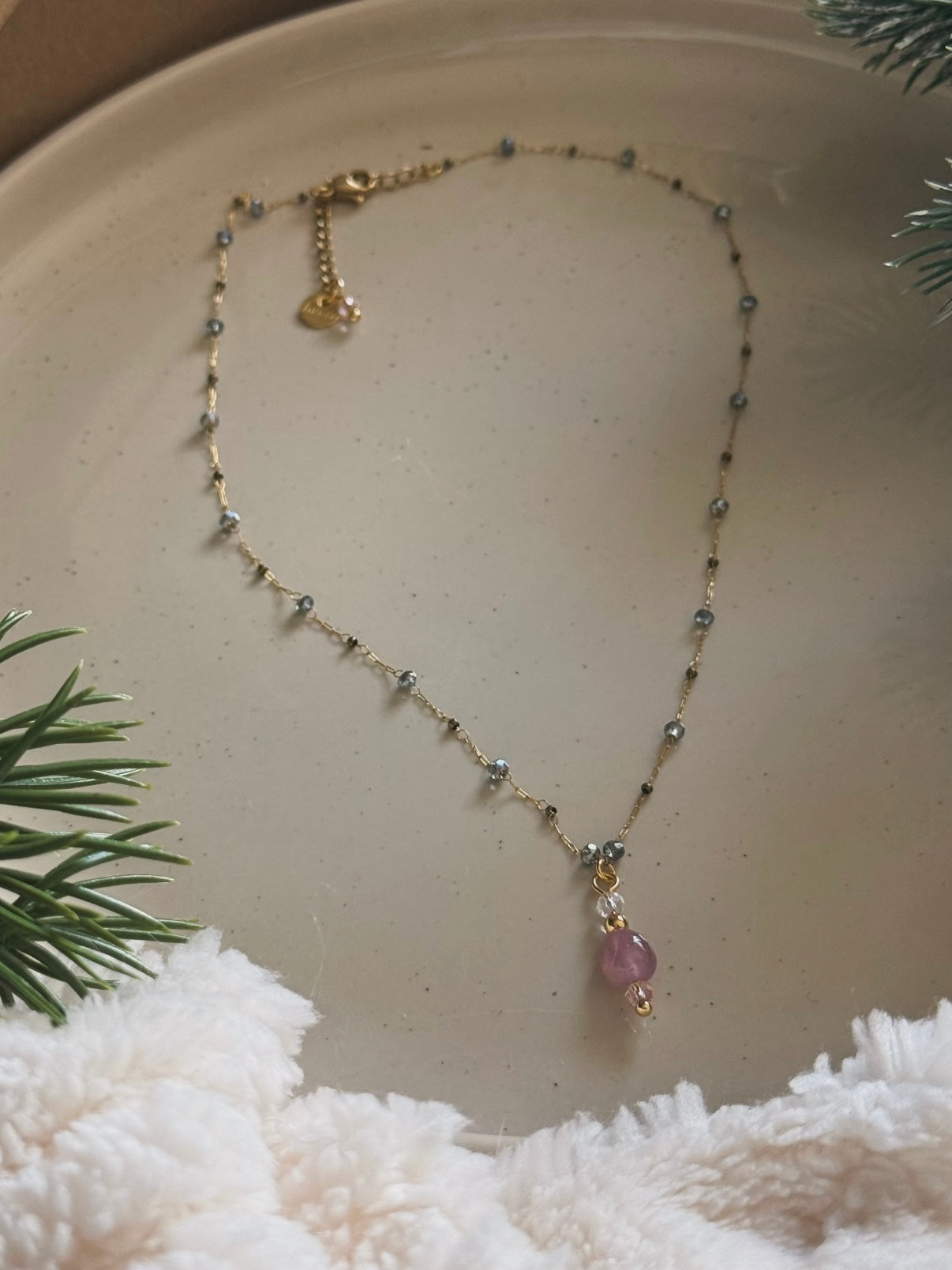 Collar artesanal que simboliza las promesas dulces y los sueños por cumplir. Una pieza especial elaborada con cuarzo rosa natural que conecta con la energía del amor y la ternura.