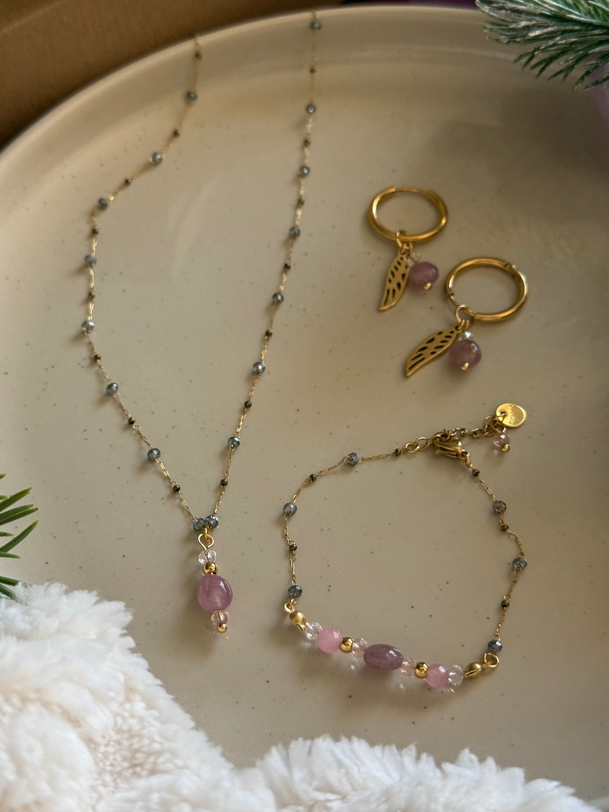 Cada pieza de este conjunto ha sido creada artesanalmente con la mejor intención, cariño y mimo, para que lleves contigo la energía de las promesas dulces protegidas por el amor celestial de tu ángel guardián.