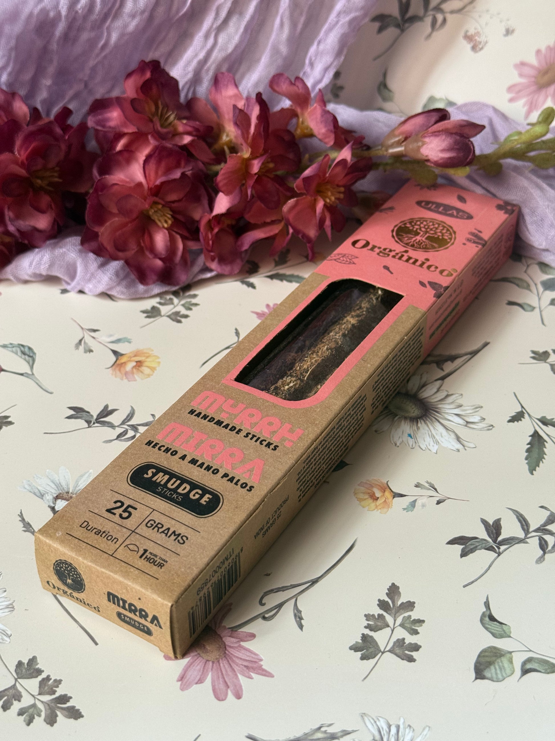 Varillas de incienso natural hechas a mano, enriquecidas con aceites esenciales naturales de mirra.