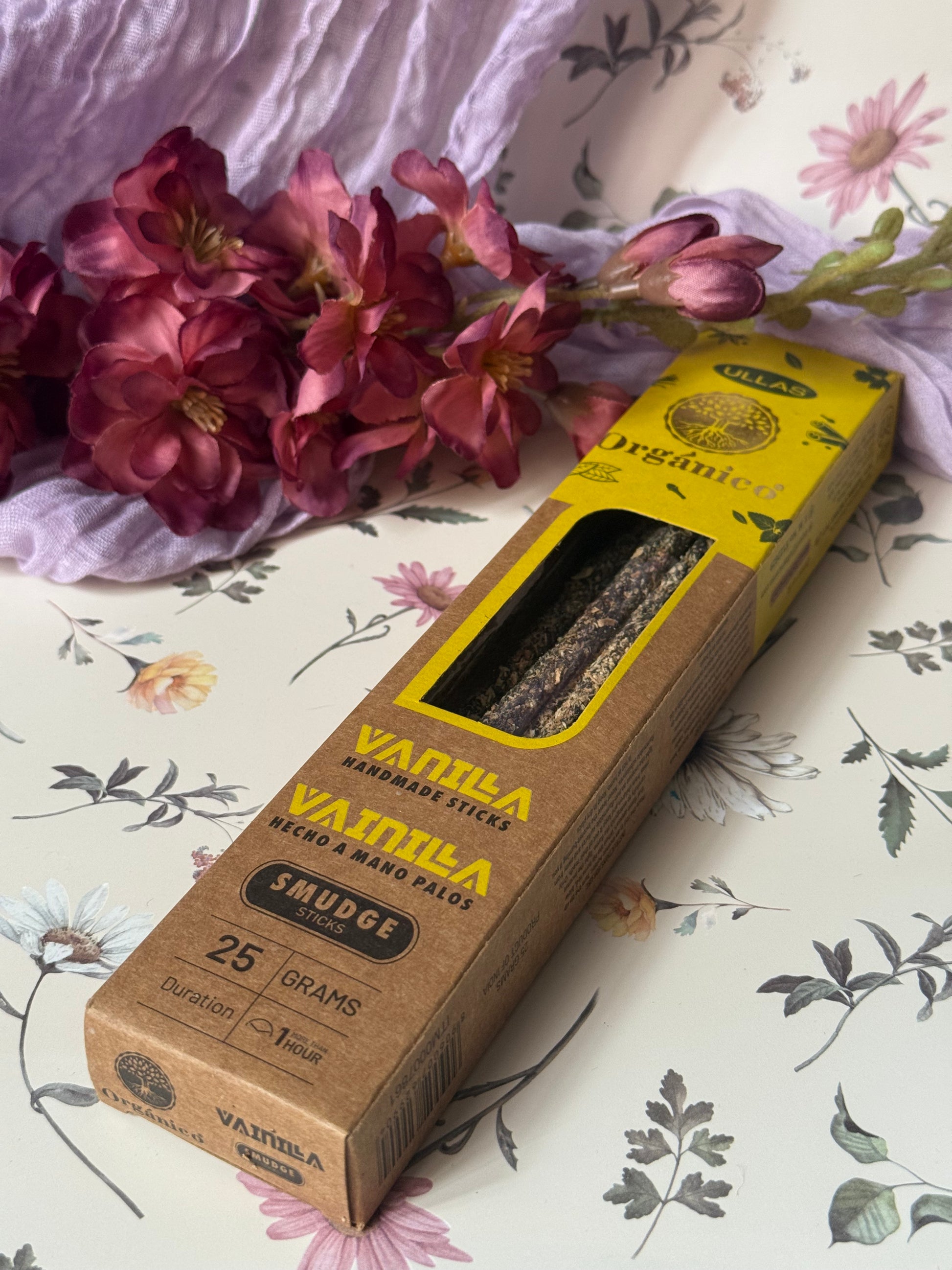 Varillas de incienso natural hechas a mano, enriquecidas con aceites esenciales naturales de vainilla.