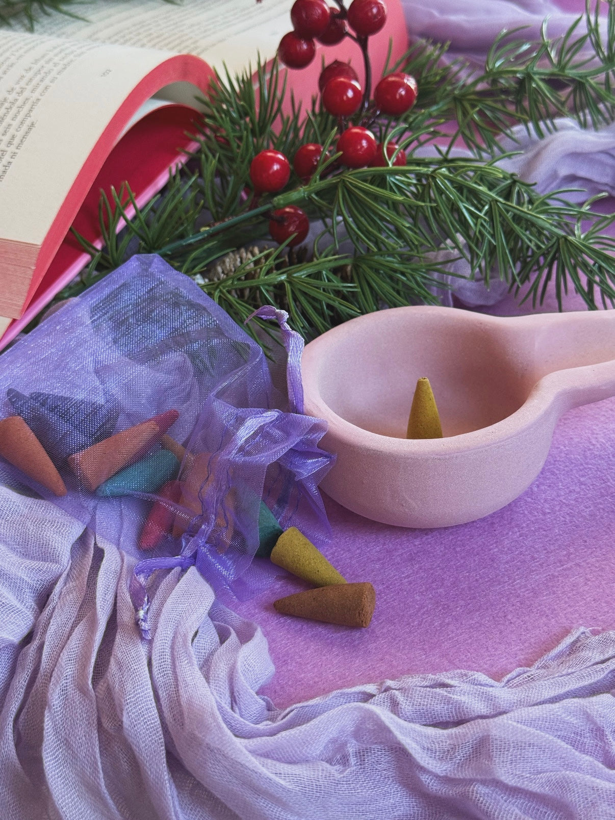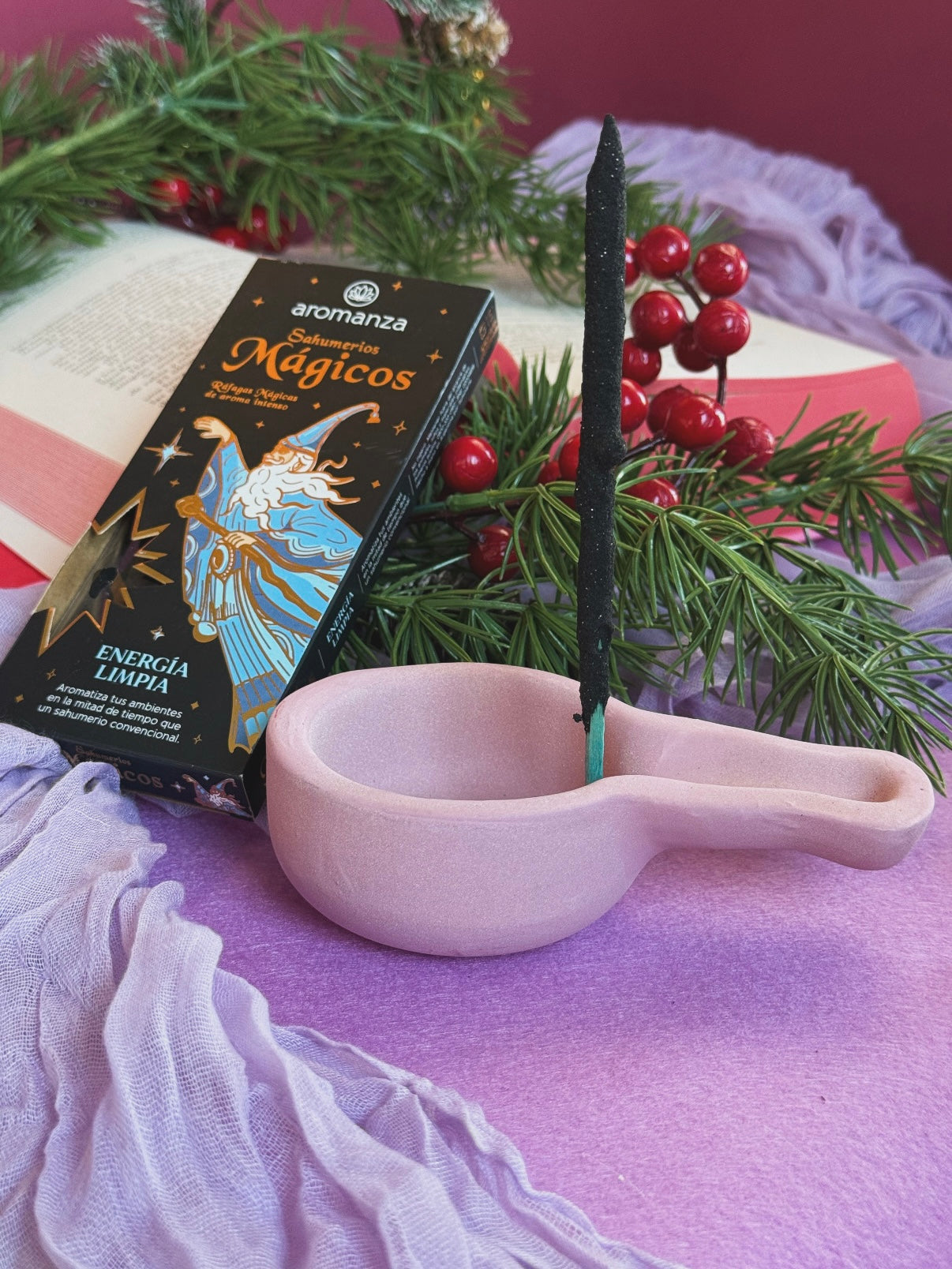 Pieza única hecha a mano en tonos suaves (azul, verde, salmón o rosa - color aleatorio). Ideal para quemar incienso en varillas, conos, hierbas o resinas. Resistente al calor y perfecto para tu altar o rincón mágico.