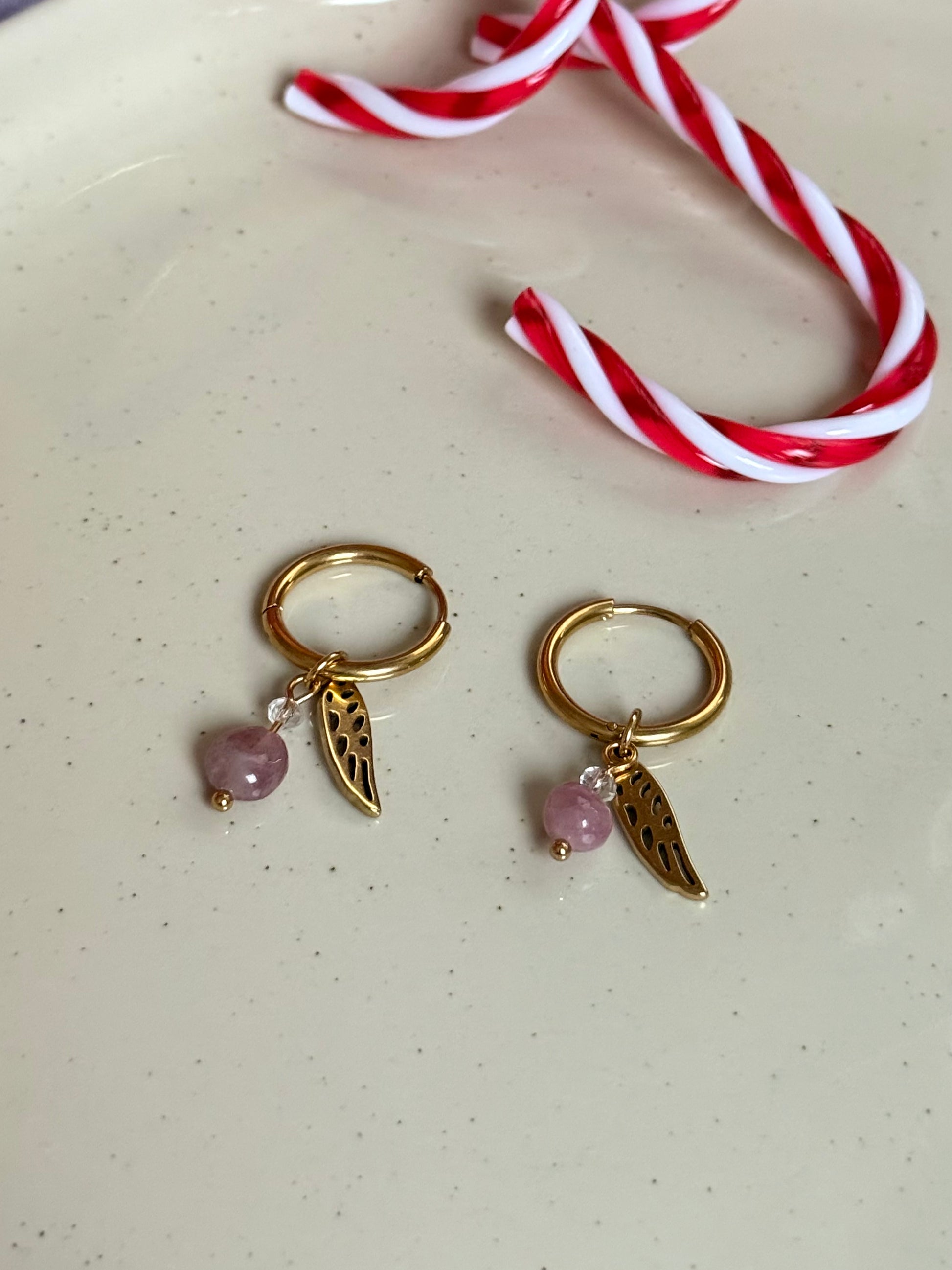 Cada pendiente lleva su propia alita de ángel dorada, creando un efecto mágico y celestial. El cuarzo rosa aporta la energía del amor mientras que las alitas doradas simbolizan la protección angelical que te acompaña siempre.