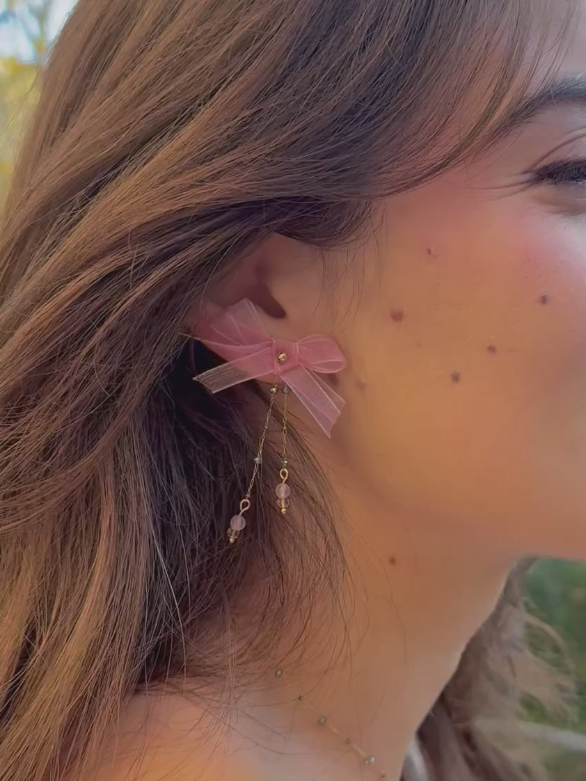 Los Pendientes Promesa de la colección Entre Núvols son una delicada combinación de ternura y elegancia. Elaborados artesanalmente con un encantador lazo rosa y cuarzo rosa natural, estos pendientes capturan la esencia de las promesas del corazón.